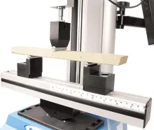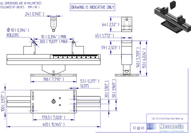 432-151 :- a simple 3-point bend jig supplied as standard with a 5mm radius upper anvil (M6 female thread connection) and two adjustable lower anvils also of 5mm radius. Lower support beam is fitted to a base plate suitable for Mecmesin motorised test stands. Used to test the flexural properties of rigid and semi-rigid materials up to 2.5 kN