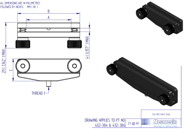 Material is gripped between two smooth spring-loaded faces which are clamped together by two locking nuts at either side of the grip to ensure the material is held securely across its entire width during testing.