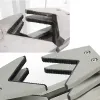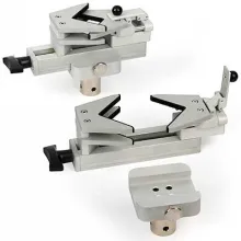 432-677 is a vice fixture for mounting to the base of a test stand when performing tension and compression tests. It has three jaws, two vertically spaced on one side, clamping with a single jaw at mid-height. The double jaw is precisely adjusted with a screw-action handle to set it in a fixed lateral position. The single jaw is moveable with it being locked and unlocked into place by a toggle-action lever. This allows for quick loading and release of the test sample.