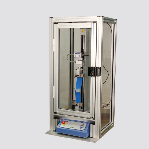 Mecmesin's standard safety guards are designed to prevent access by the operator to the testing area whilst the test is in progress. Guards feature an aluminium frame with integrated polycarbonate panels to allow the operator to view the test area from outside. A hinged door is fitted with a switch-activated interlock mechanism, which prevents operation of the test system when open.