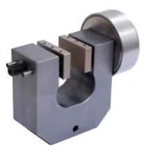This configuration allows a jaw to be manually set in a position to align a test specimen around the central axis. The other jaw clamps the specimen in place via the action of the pneumatic piston applying up to 2.5 kN constant clamping force
