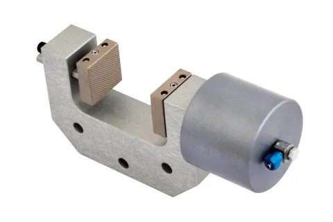 This configuration allows a jaw to be manually set in a position to align a test specimen around the central axis. The other jaw clamps the specimen in place via the action of the pneumatic piston applying up to 1.2 kN constant clamping force