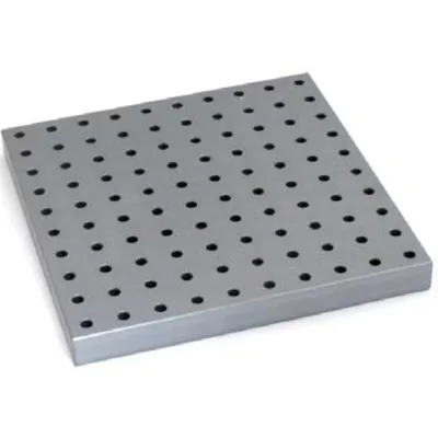 Square Compression Plate in aluminium featuring perforations to allow air release during testing - suitable for foam testing. Holes are 6mm diameter and spaced at 20mm intervals.
