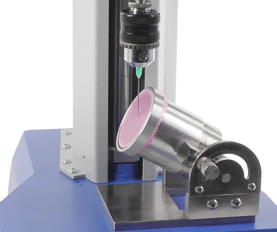 바늘 끝의 구성 요소는 침투력에 영향을 미칩니다. 바늘 끝의 요소와 삽입 력 그래프에 미치는 영향 Mecmesin Asia는 고객과 협력하여 삽입 프로세스의 특성을 이해하고 조건을 복제하며 정확하고 반복 가능한 테스트 방법을 가능하게했습니다. 테스트 샘플에 삽입 각도를 조정할 수 있도록 맞춤형 고정구가 제작되었으며, 일반적으로 15 도의 표준 사양이 사용됩니다. 인간 피부의 인성 특성을 모방 한 PVC 시트는 멤브레인을 완전히 통과 할 수 있도록 충분한 내부 클리어런스가있는 하부 고정물 위에 있습니다.