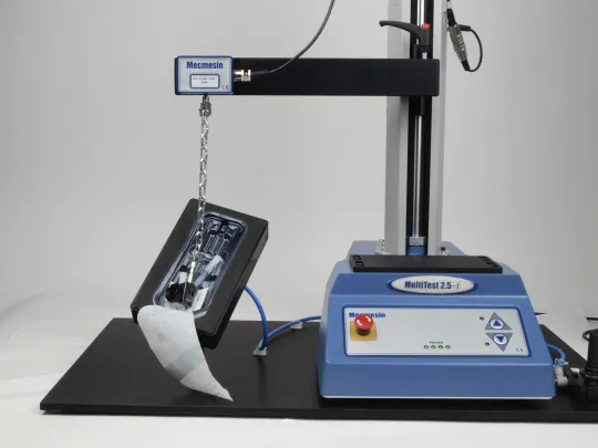 변형되지 않도록 반 강체 포장을 고정하려면 각 포장 디자인에 대한 맞춤형 적용이 필요합니다. Mecmesin은 열 성형 트레이에 정확히 맞도록 일치 된 홈에 진공 홀더를 설계하고 확장 된 인장 테스트 암 아래에 필요한 각도로 배치했습니다. 그런 다음 유연한 체인 링크의 핀치 그립을 사용하여 규정 된 45도 각도로 끝에서 끝까지 완전히 덮개를 벗겨 냈습니다.