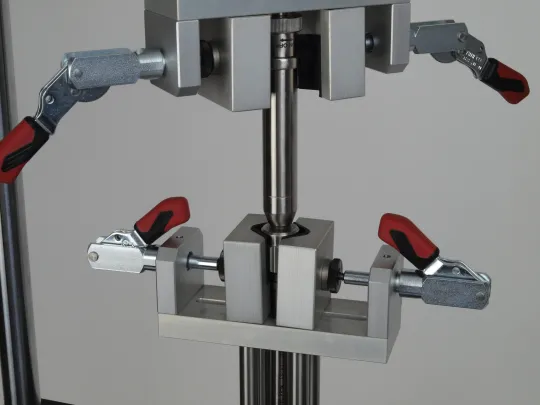 Mecmesin은 의료 기기의 전체 길이를 수용 할 수 있도록 컬럼 높이를 확장하여 Vortex-i 토크 테스터를 채택했습니다. 중앙 지지대가 추가되어 그 위에 장치가 V 자형 클램프의 한쪽에 고정됩니다. 다른 쪽 끝은 토크 센서에 연결된 두 번째 V 자형 클램프에 고정됩니다.