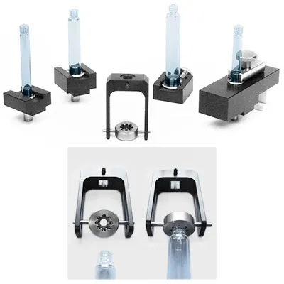 관련된 토크가 매우 작기 때문에 범용 맨드릴이 토크 센서에 연결된 스트 럽에 삽입됩니다. 이를 통해 토크 측정에 부정적인 영향을주지 않고 피팅이 나사를 켤 때 맨드릴이 수직으로 이동할 수 있습니다.