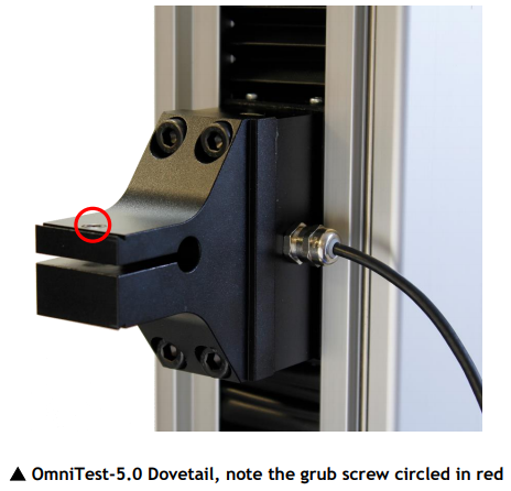 The OmniTest-5.0 has a dovetail bracket attached to the moving crosshead, which tightens by using an Allen key on the embedded screw.