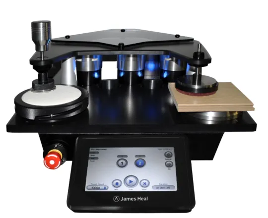 The Martindale abrasion tester was further developed for use on wood in collaboration with Institut für Holztechnologie (Institute for Wood Technology) Dresden, Germany. Its use is specifically required in test standard PD CEN/TS 16611: Furniture. Assessment of the surface resistance to microscratching. As abrasion is defined as the surface wear caused by rubbing with another material, the principle of abrasion testing is to ‘rub’ the test sample surface with an abrasive material, under certain conditions. The Martindale implements circular motion to provide multi-directional rubbing, delivering results more representative of the actual end-use than other methods in the market, which scratch the surface in a straight line only. The motion is that of multiple ‘Lissajous figure’ curves, created as the tester cycles through the rubs.