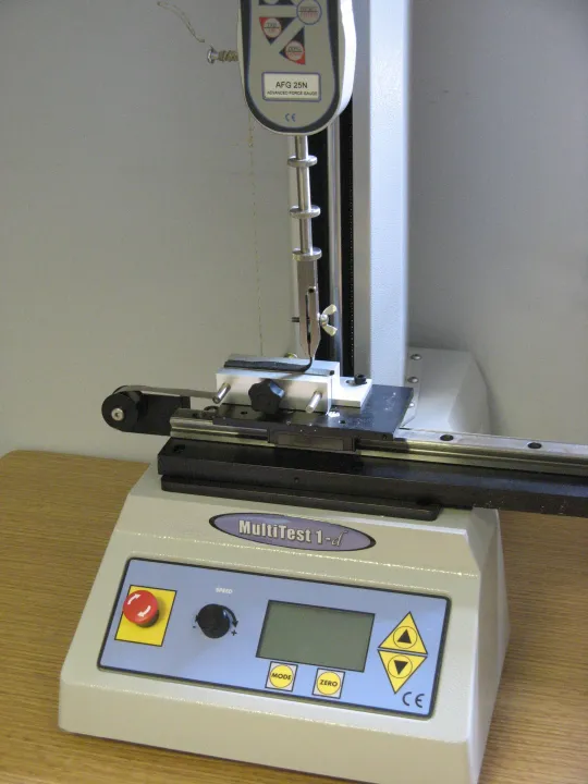 Mecmesin designed and manufactured the complete fixturing, incorporating a vice to grip the metal substrate from which the adhered leather was to be peeled. Inserting and removing the test samples was then very quick and precise, allowing rapid and repeatable testing.