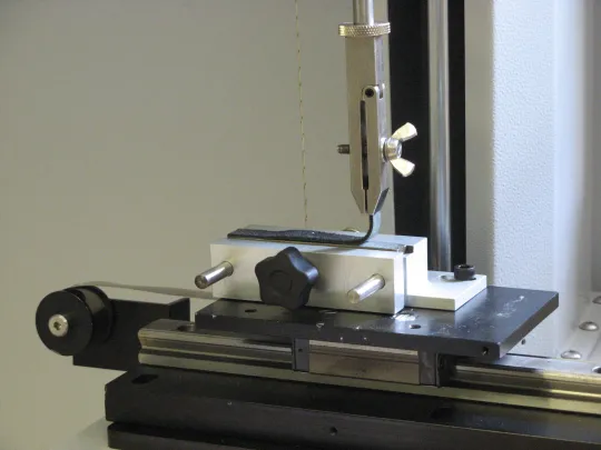 A 90-degree peel test is straightforward enough, but gripping the bonded metal/leather test sample required a custom vice to be mounted on a standard peel sliding-table.