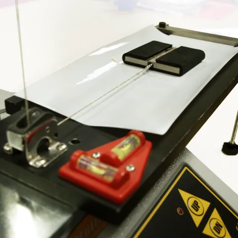 Test fixtures and sleds are available for films, foils, paper, packaging trays, and other material interfaces.