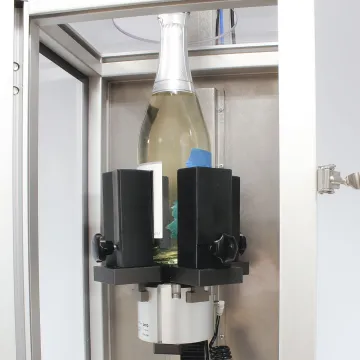 起泡葡萄酒瓶由一组 4 个可互换的橡胶面夹钳固定。这些夹钳通过气动卡盘夹紧酒瓶;气动卡盘是首选方案,因为它的操作速度更快,而且更符合人体工程学,便于操作员使用。也可以指定手动操作的夹钳。